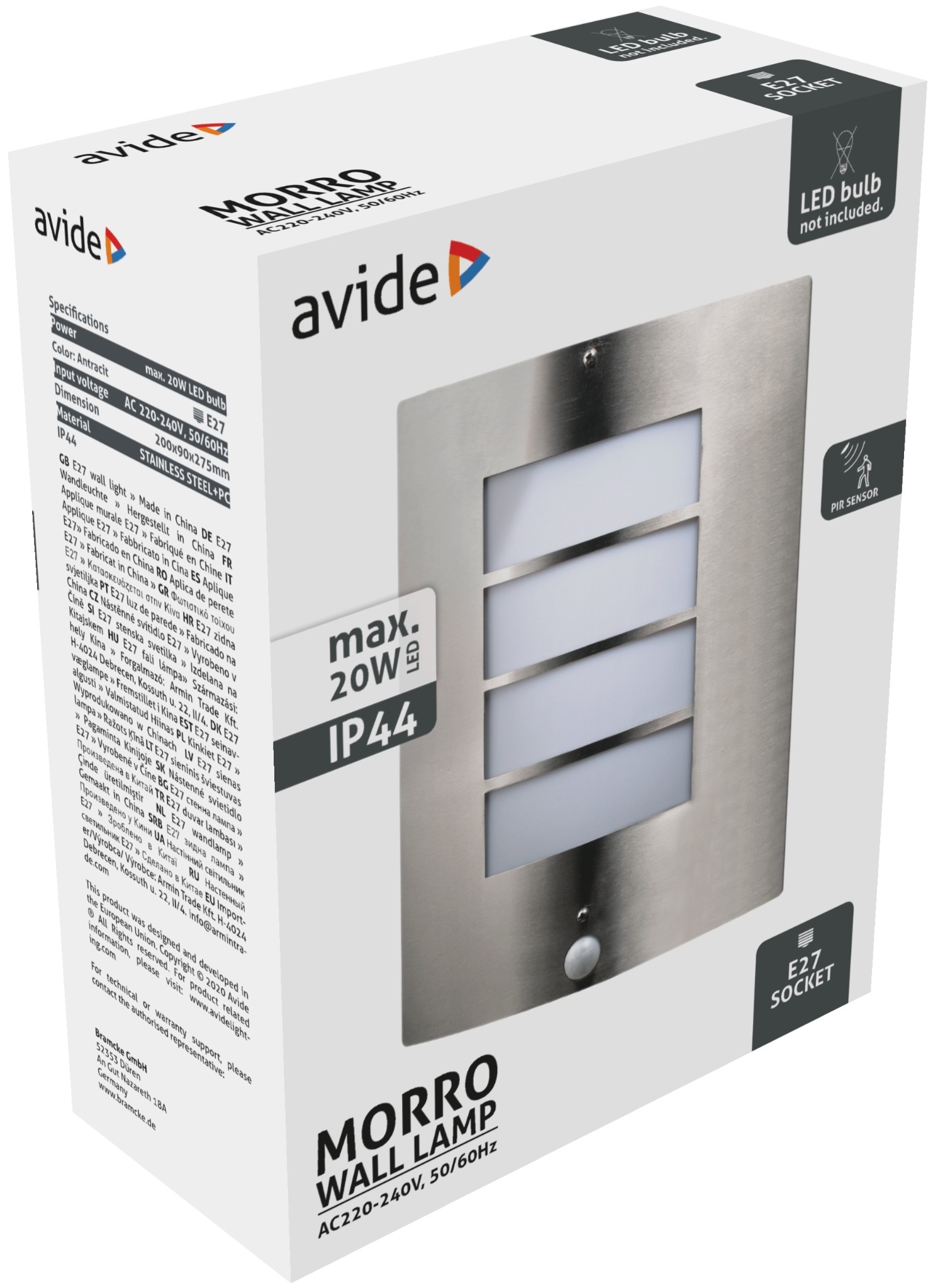 Avide kültéri fali lámpa Morro 1xE27 PIR IP44 Szatén Nikkel