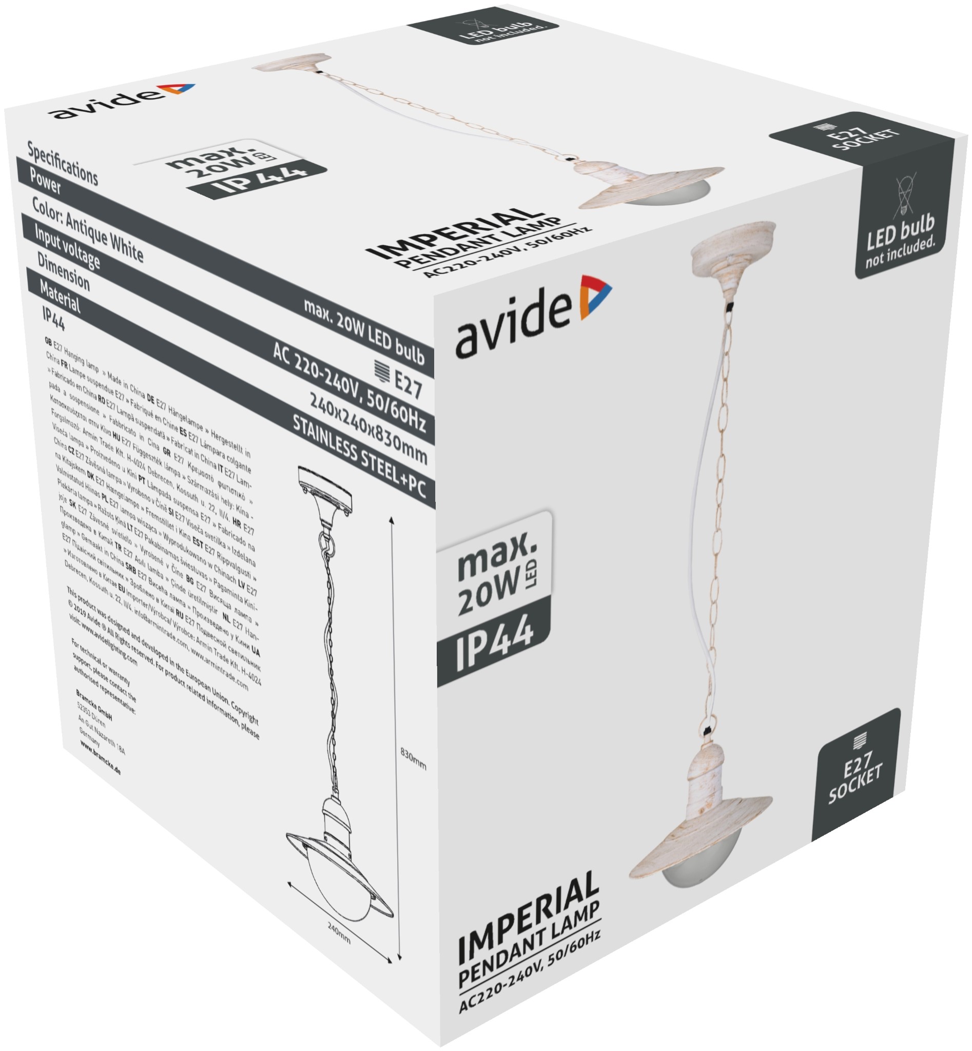 Avide kültéri függeszték lámpa Imperial 1xE27 IP44 antik fehér | BR (SKU:AOLHE27-IMP-AW)