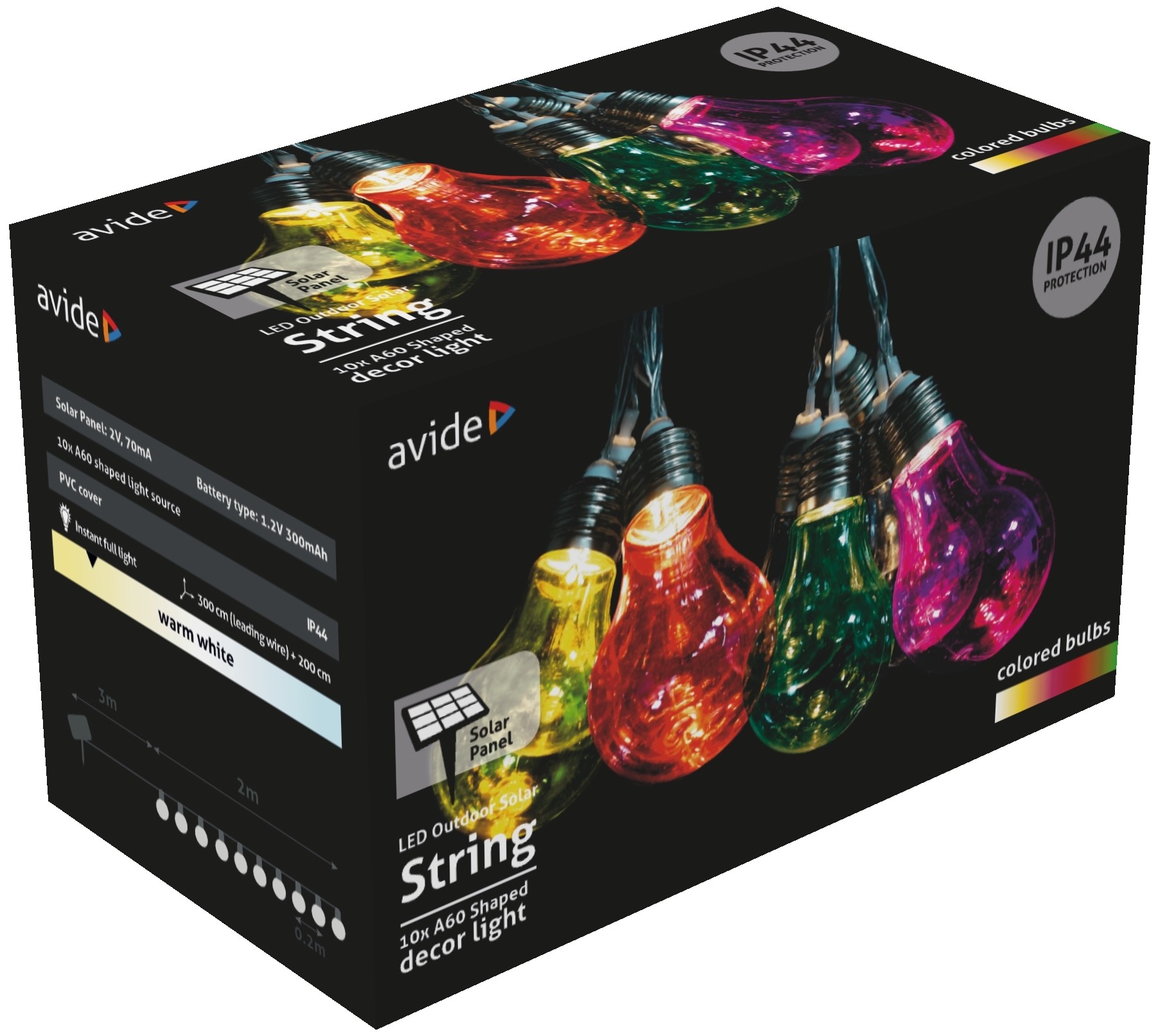 Avide Kültéri Szolár Füzér 5m, Átlátszó Kábel, 10 Színezett Globe, IP44 | BR (SKU:AOSS5T-10MC10L)
