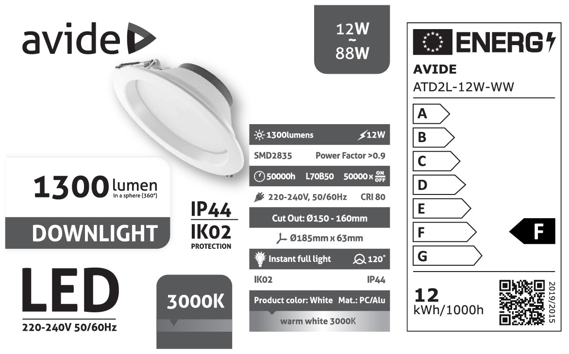 Avide LED Downlight Kerek IP44 12W 1300lm WW 3000K | BR (SKU:ATD2L-12W-WW)