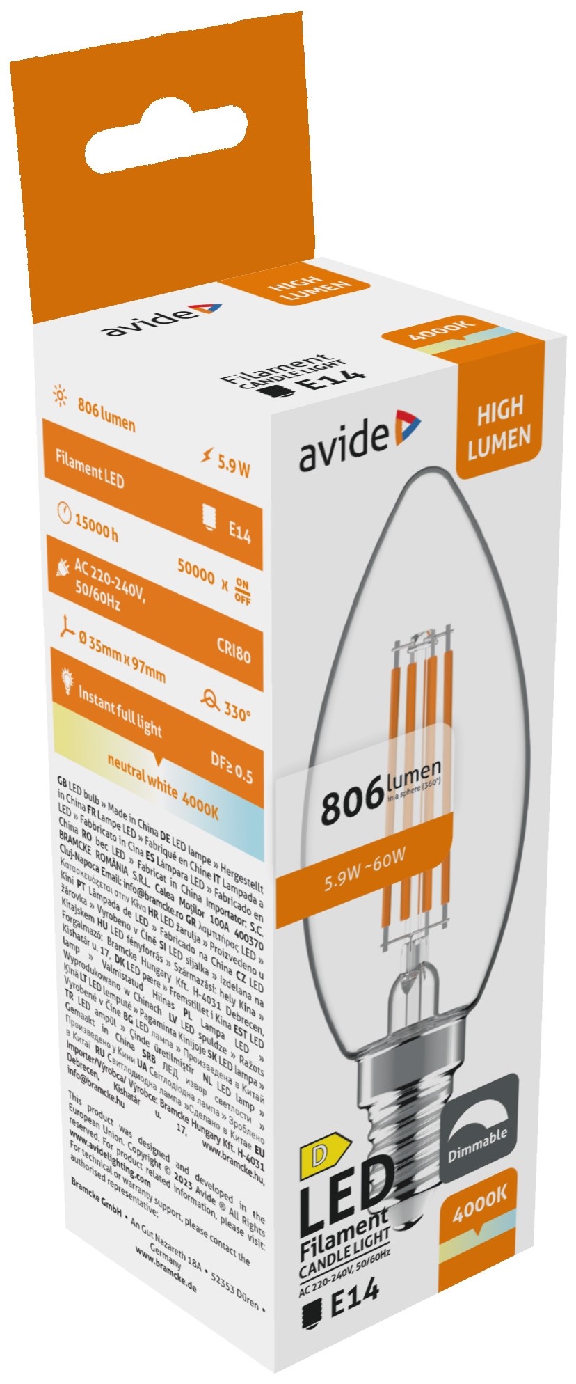 Avide LED Filament Candle 5.9W E14 NW 4000K Fényerőszabályozható | BR (SKU:ADLFC14NW-5.9W)
