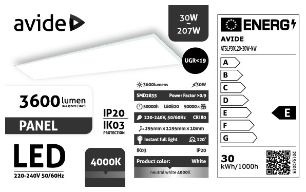 Avide Led Panel 300x1200mm 30W NW 4000K 3600lm UGR<19 IP20 Industrial V2