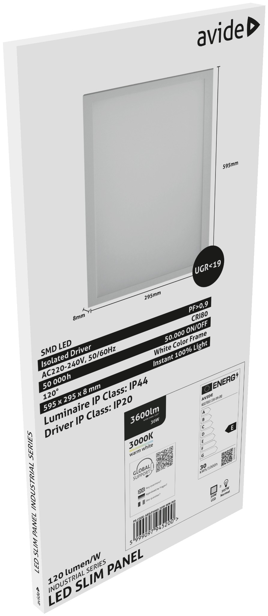 Avide LED Panel 300x600mm 30W WW 3000K 120lm/W UGR+IP44 Industrial Range