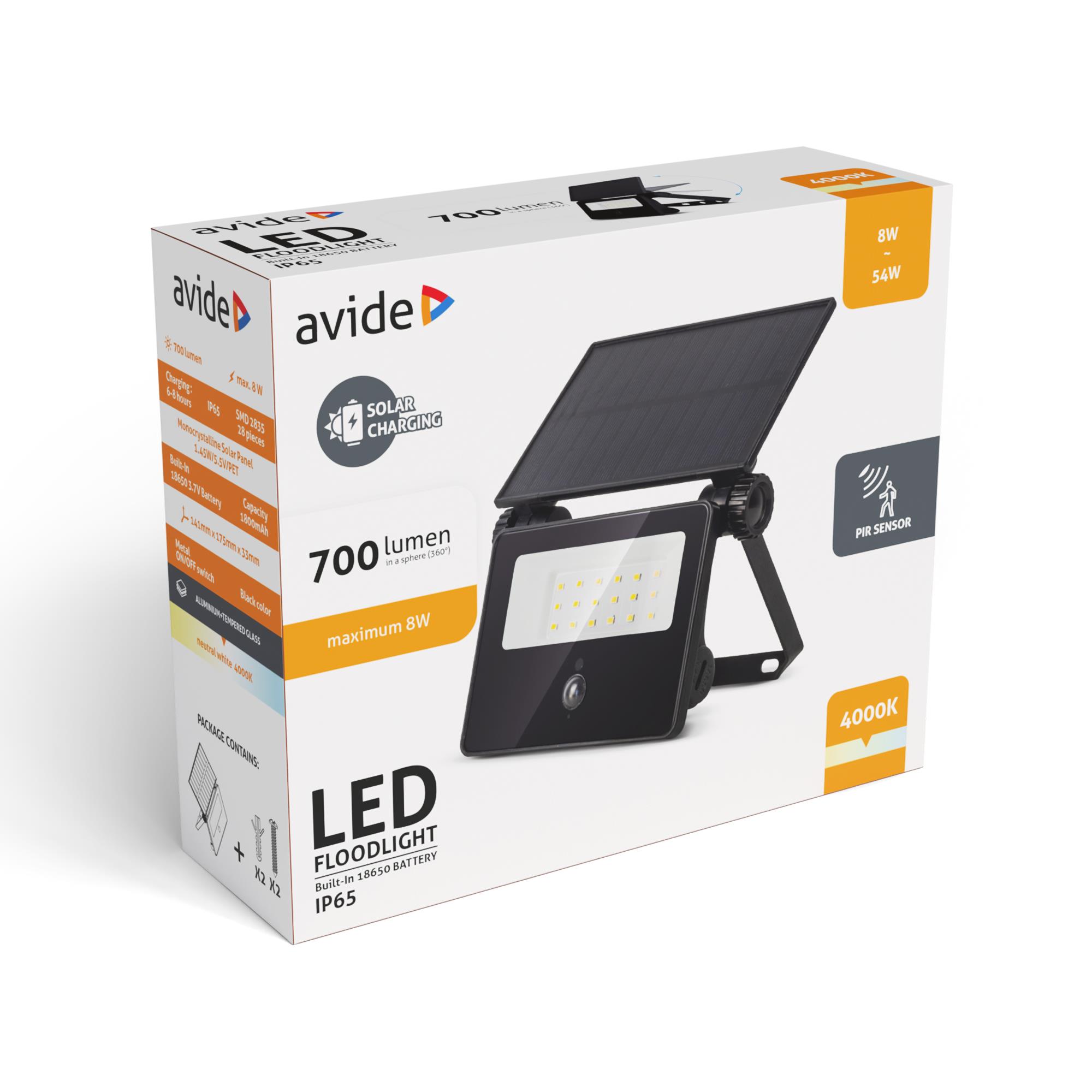 Avide Szolár Reflektor 4000K, Cserélhető Akkumulátor, Kompakt Napelem, 700lm, PIR szenzor