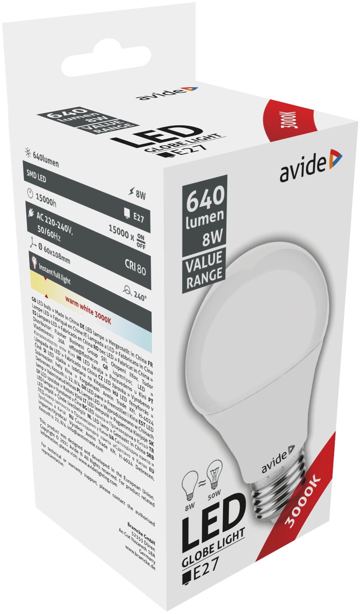 Avide Value LED Globe E27 8W WW 3000K