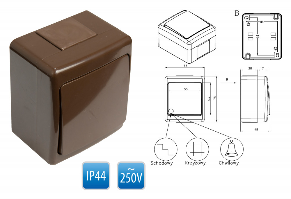 Barna egypólusú kapcsoló, kültéri, vízmentes, IP44