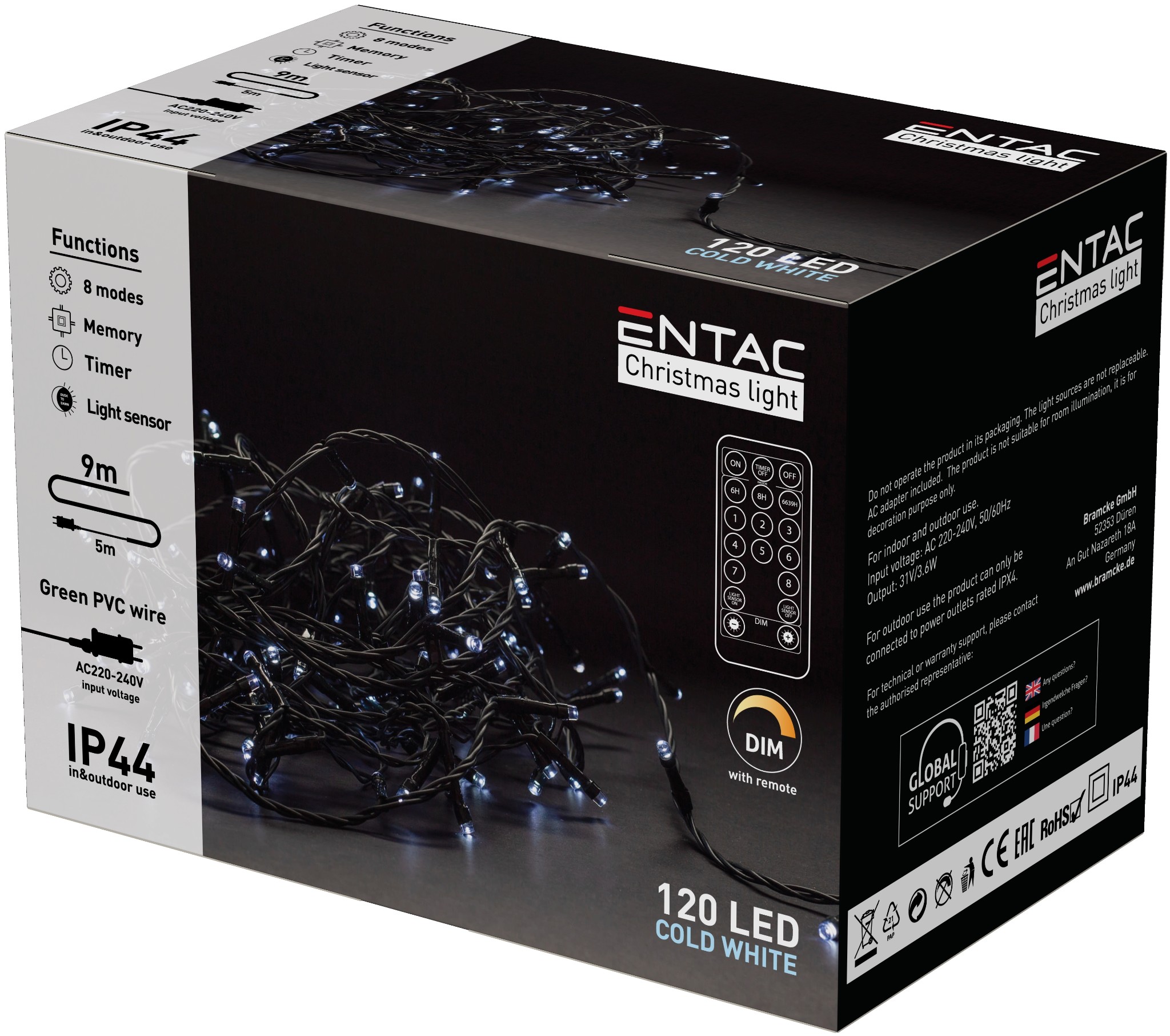 Entac Karácsonyi IP44 120 LED Füzér CW 9m Távirányítóval