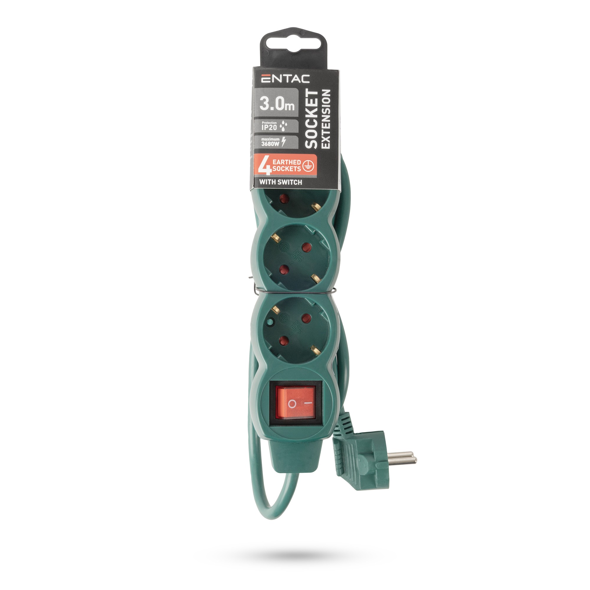Entac S1 Elosztó 4 Foglalat Kapcsolóval 3m 3G1.5, Zöld