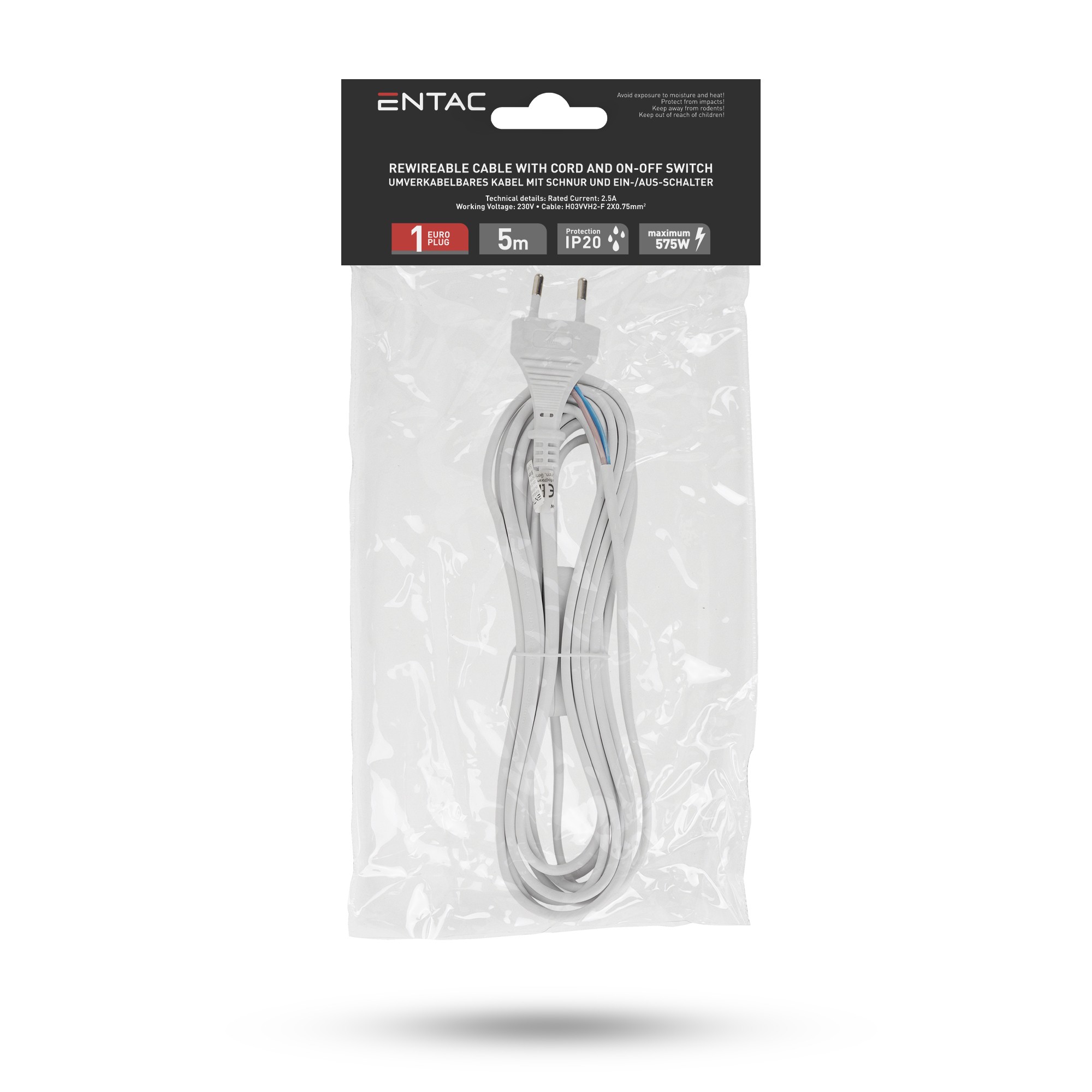 Entac Szerelhető hálózati kábel 2G0.75 5m, Kétállású kapcsolóval, Fehér