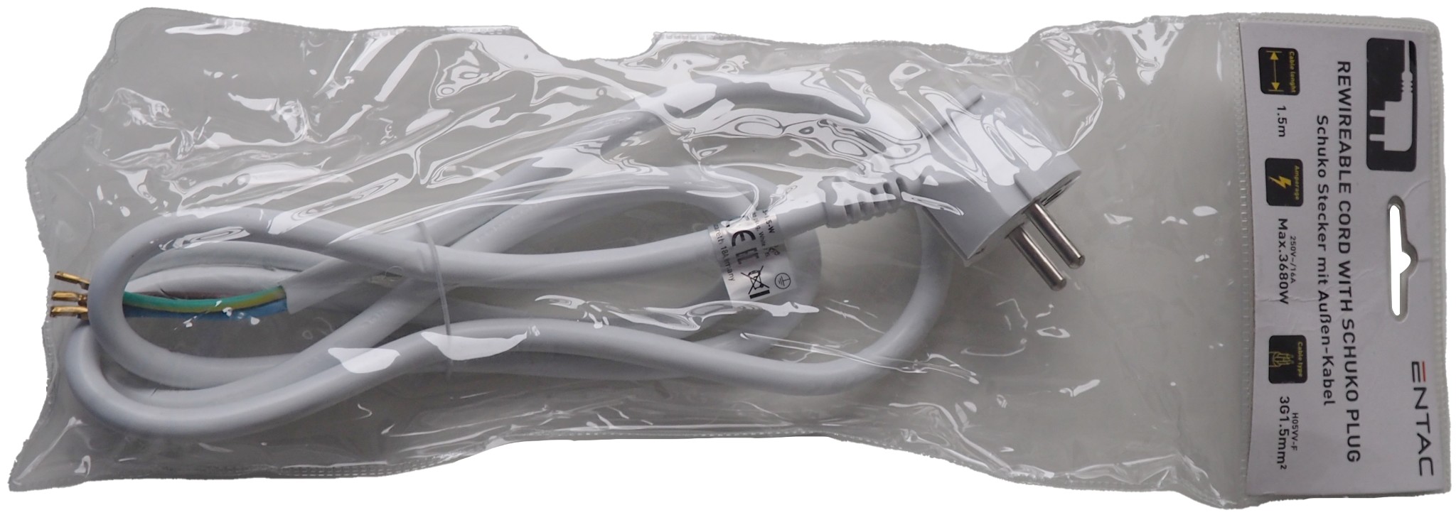Entac Szerelhető hálózati kábel 3G1.5 1.5m Földelt Dugvillával Fehér