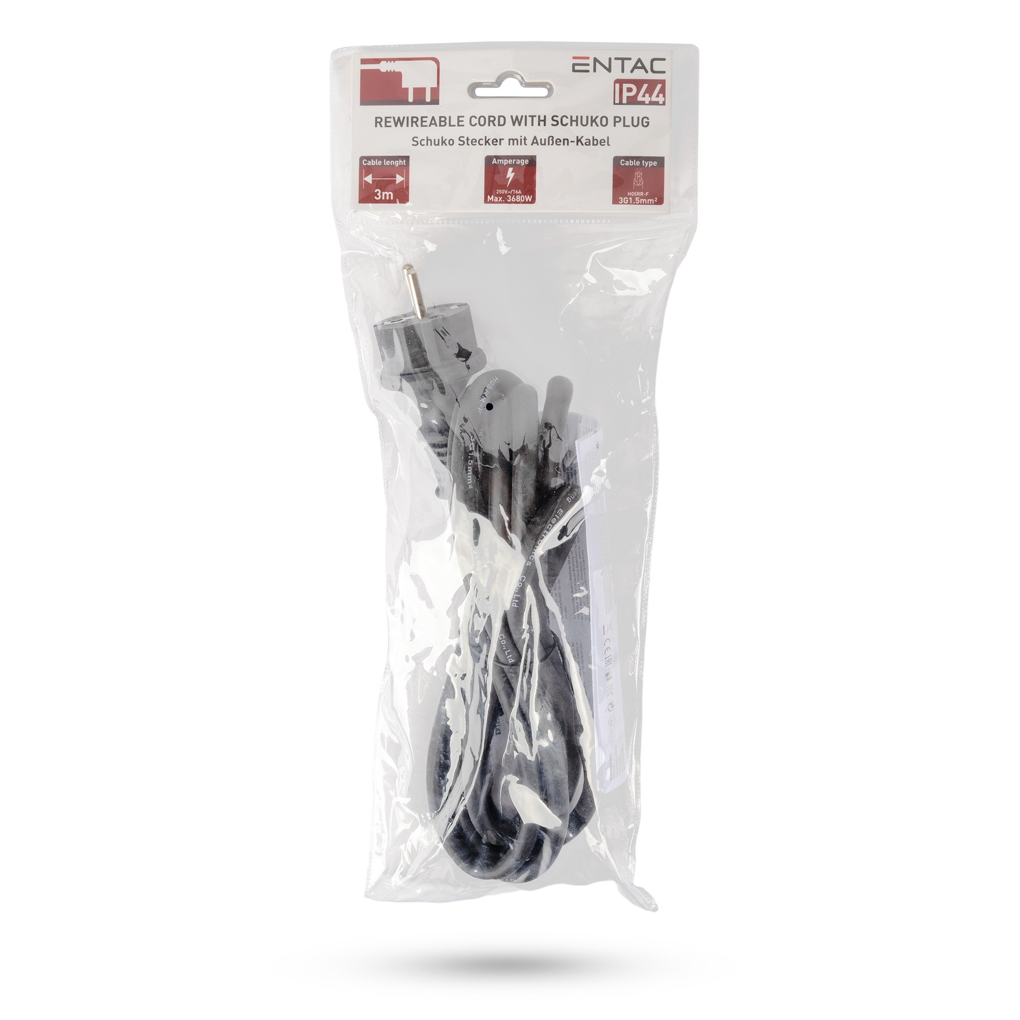 Entac Szerelhető hálózati kábel 3G1.5 3m Földelt Dugvillával Fekete IP44