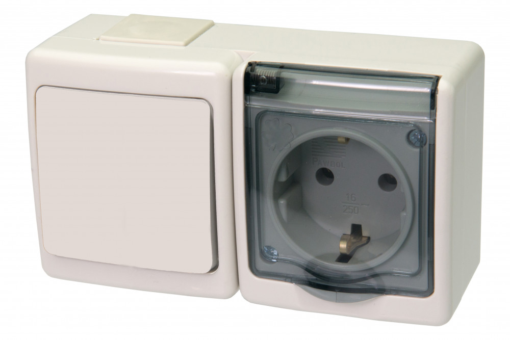 Fehér egypólusú kapcsoló + egyes dugalj átlátszó csapófedéllel, kültéri, vízmentes, IP44,