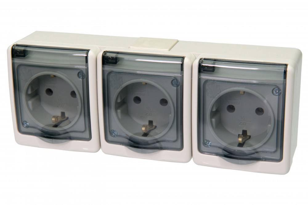 Fehér tripla dugalj, kültéri, vízmentes, átlátszó csapófedéllel, IP44