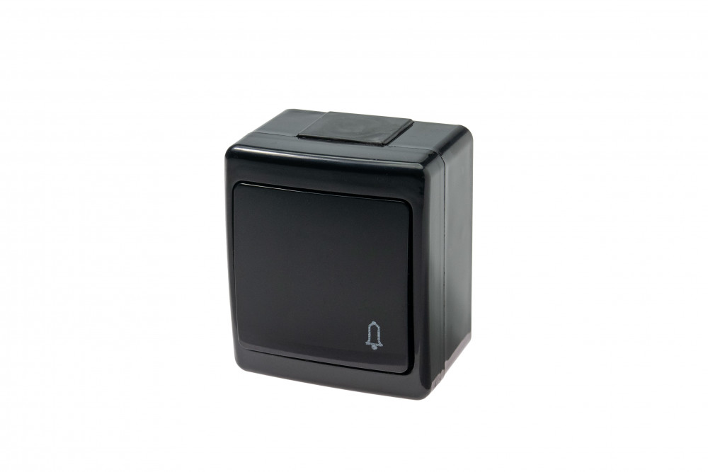 Fekete nyomókapcsoló csengőjellel, kültéri, vízmentes, IP44