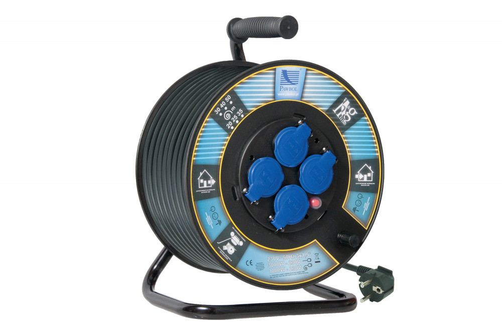 Hosszabbító kábeldobon, 3×1,5 gumi vezeték – 25m, 4db aljzat; dobátmérő: 300mm; IP44