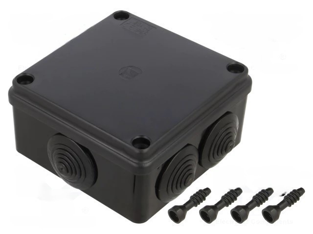 Kötődoboz, 6 gumi bevezetővel, fekete, 100x100x50mm, IP65, UV-álló